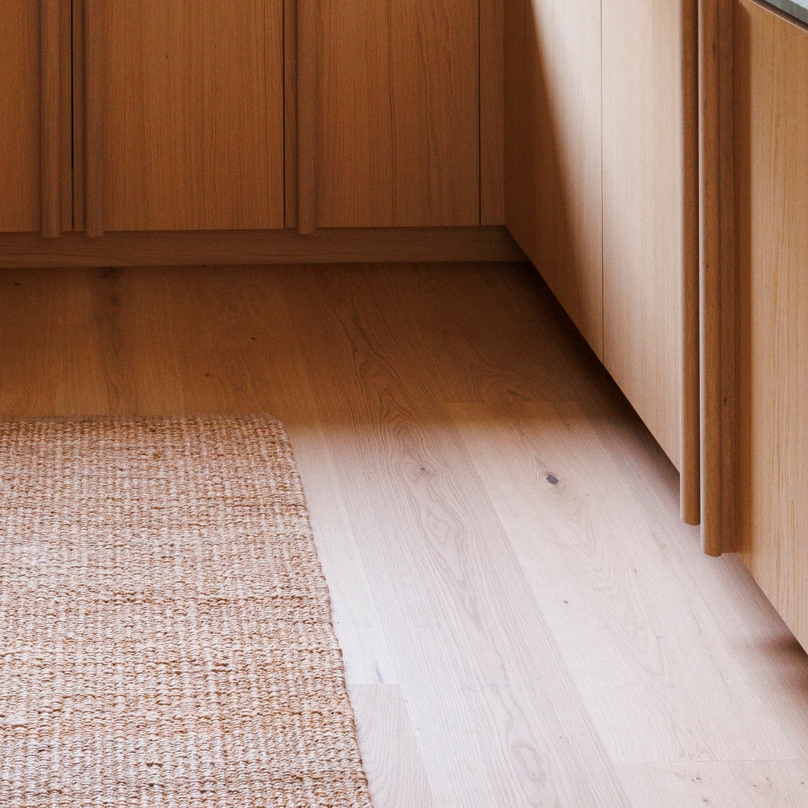 Wide-plank oak flooring and integrated cabinetry by MADERA unite kitchen and living areas in this open-concept design.